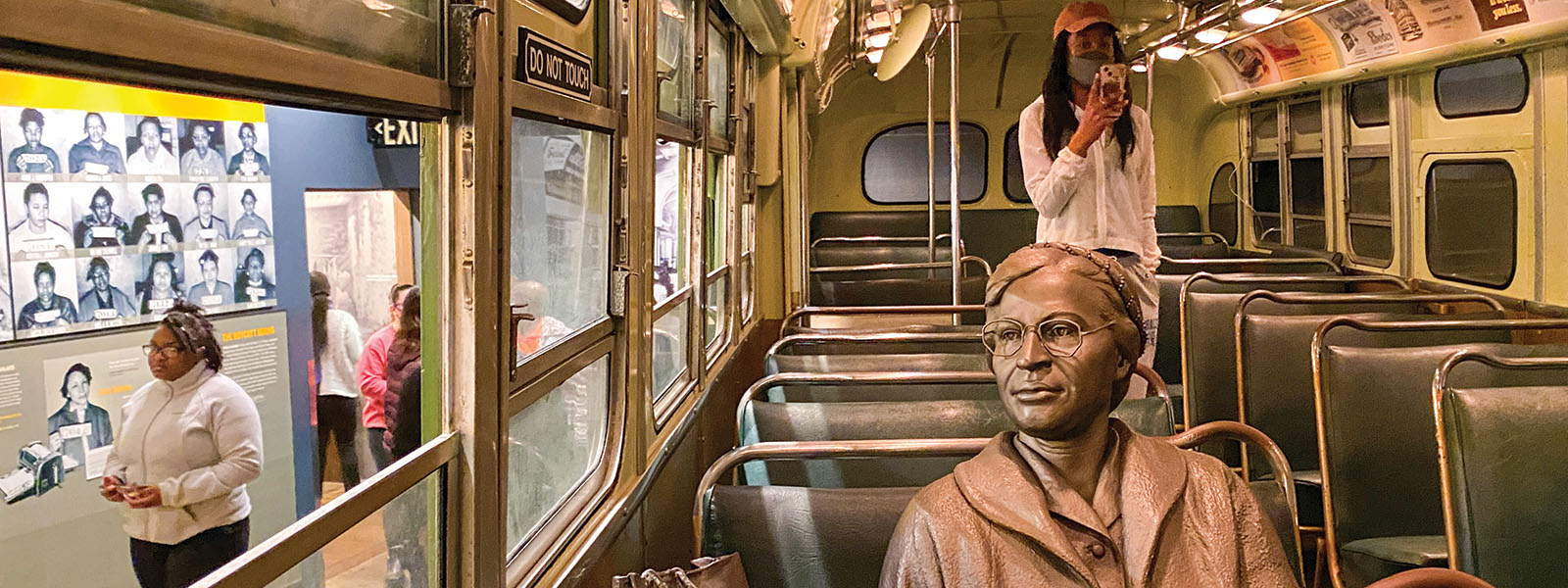 Nyelah O'Meally ’23, at left, touring the National Civil Rights Museum in Memphis, Tennessee, which includes an interactive bus exhibit about Rosa Parks. Classmate Zipporah Sparkman ’26 takes a photo on the bus. The experience was part of the annual Civil Rights Journey Solidarity and Social Justice Retreat. Read story »