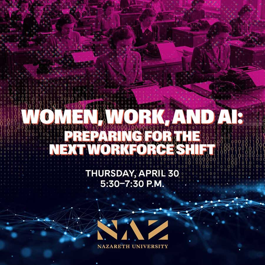 Nazareth University will host Women, Work, and AI: Preparing for the Next Workforce Shift on Thursday, April 30, from 5:30–7:30 p.m. in the Shults Center Forum on campus, bringing together leading voices to explore how artificial intelligence is reshaping the workforce and what it means for women’s careers.