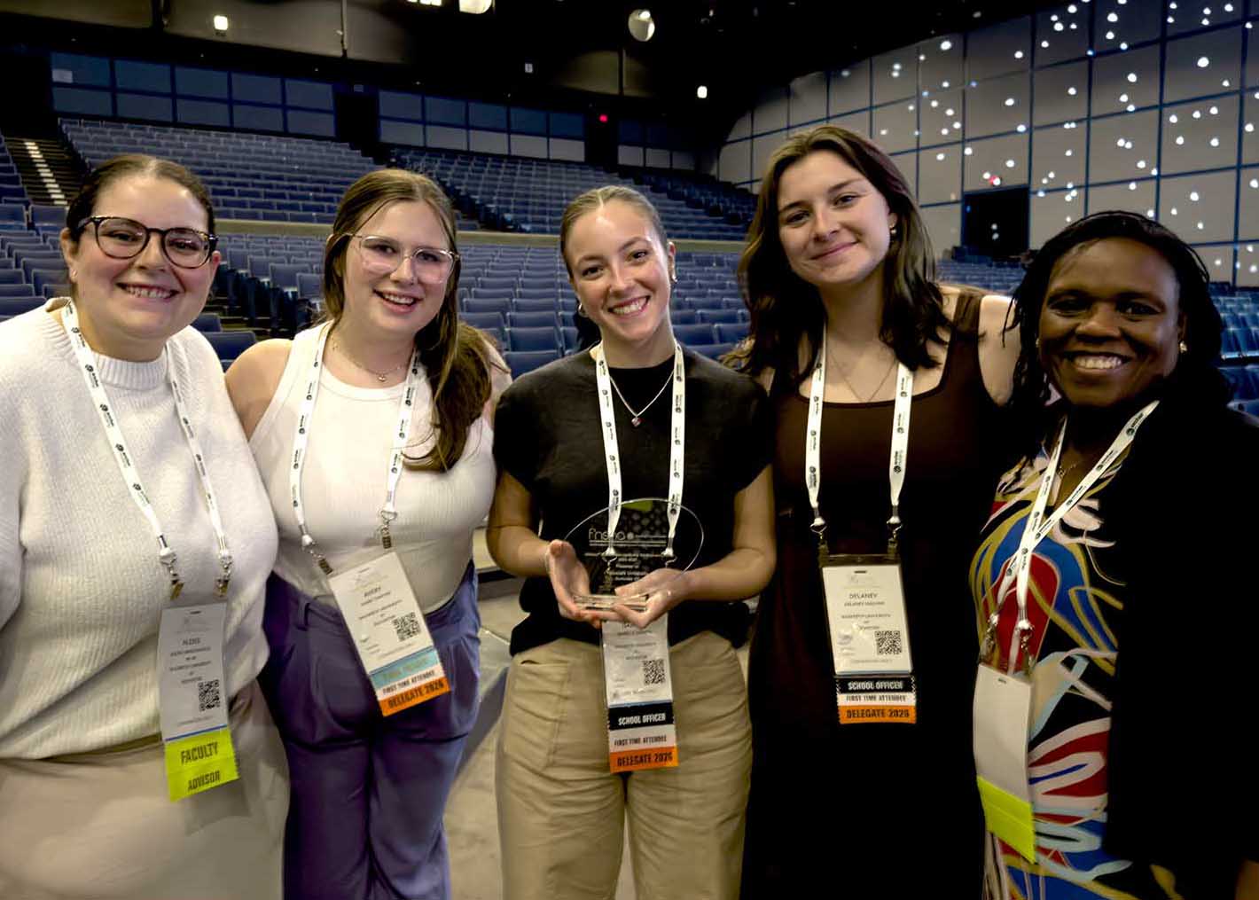 (Left to Right) Nursing Professor Alexis Masciangelo, nursing students Avery Tanton, Isabella Iannitti, and Delaney Malone, and Nursing Professor Marie Bell attended the National Student Nurses’ Association conference in Houston, TX in April.
