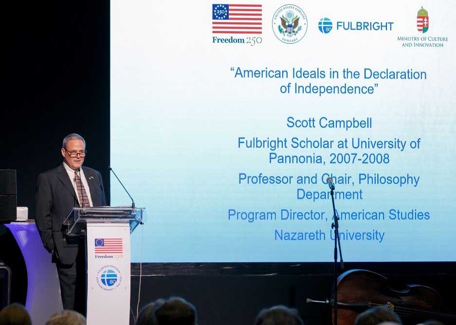 Nazareth University Professor and Fulbright alumnus Scott Campbell, Ph.D., recently spoke in Hungary at a historic celebration honoring two milestones: the 80th anniversary of the Fulbright program and the 250th anniversary of the United States. Nearly 130 Hungarian and American Fulbright alumni, university partners, diplomats, and stakeholders gathered Jan. 26 at the Hungarian National Gallery in Buda Castle.